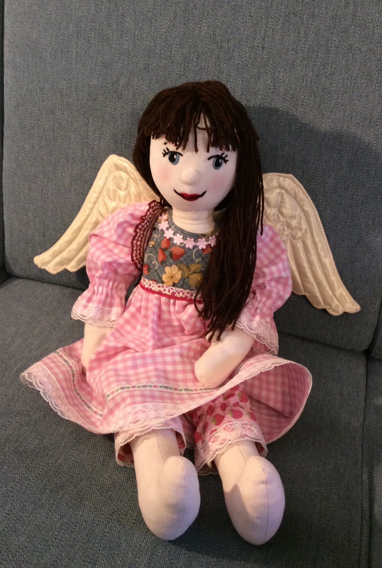 Die komplette Puppe und ihre Ausstattung sowie die Flügel habe ich genäht. Ausgangspunkt waren je ein Schnittmuster für die Puppe und eins für Kleid und Unterhose. Die Flügel habe ich "dazuerfunden"; sie sind abnehmbar, und ihre Befestigung sieht aus, als würde sie zum Kleid gehören. Die Ausgestaltung von Gesicht, Haaren und Kleidung sowie der Flügel nach meinen Ideen. Den zart hautfarben getönten Stoff für den Puppenkörper habe ich aus einem alten Betttuch hergestellt, das ich mit Naturfarben "aus der Küche" gefärbt habe.