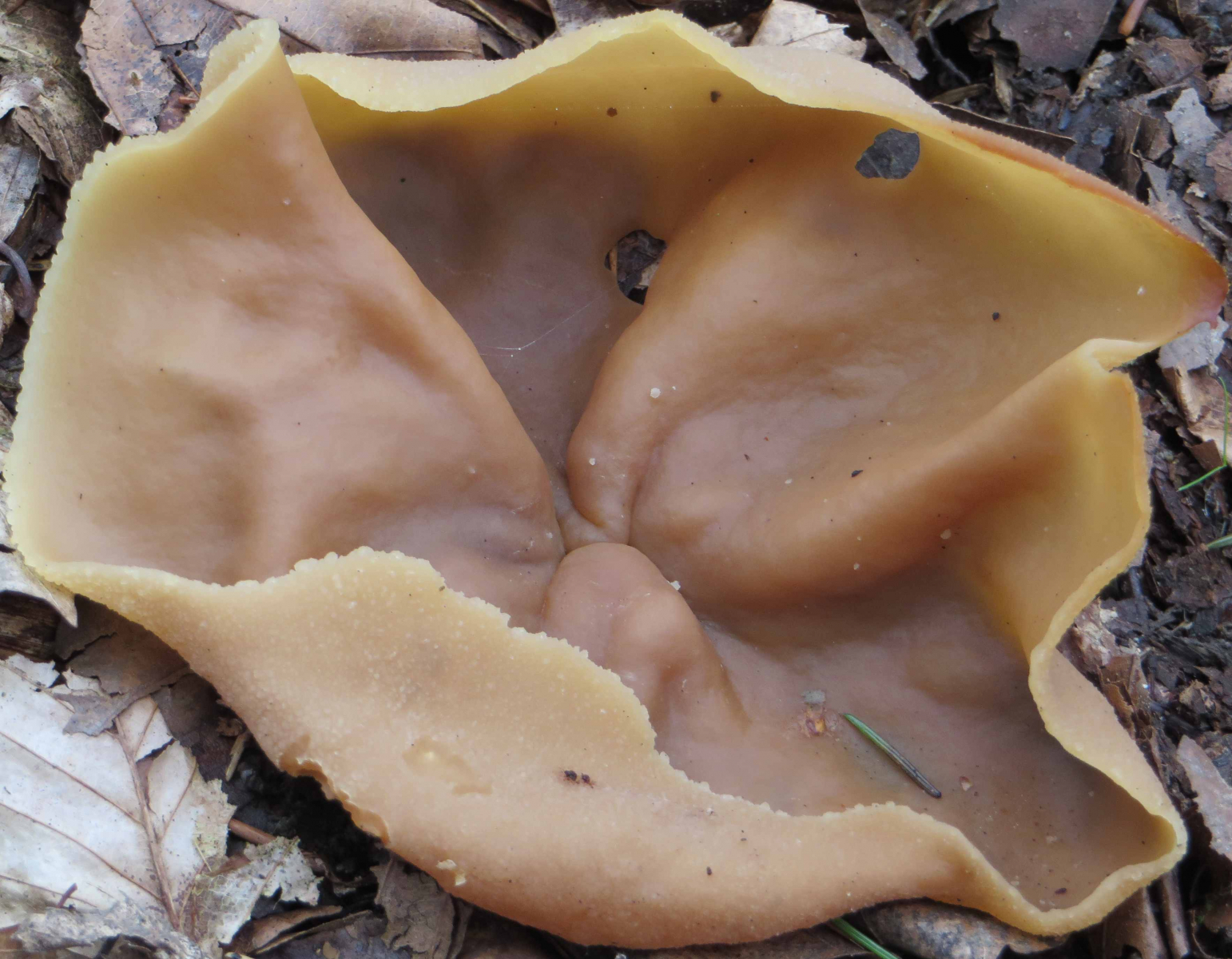 Die zwei ist kein Öhrling, sondern ein Becherling aus der Gattung Peziza. Wenn da nicht irgendwie beim Kaputtmachen weißer oder bunter Saft rauskam, wird's wohl ohne Mikroskop keine sichere Art werden.