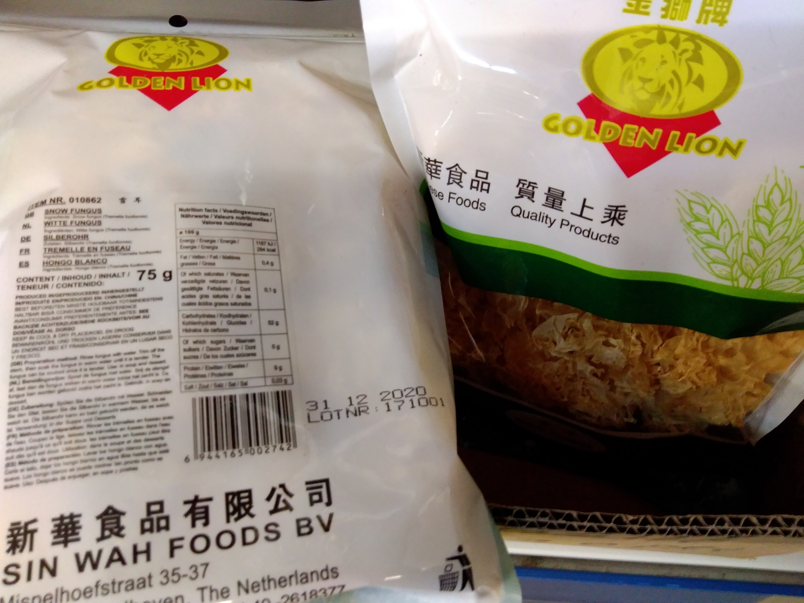 Wenn Du das Bild anklickst und in voller Größe aufmachst, kann man sogar Enoki / Flamulina velutipes / Collybia velutipes in verschiedenen Sprachen auf der Verpackung lesen.