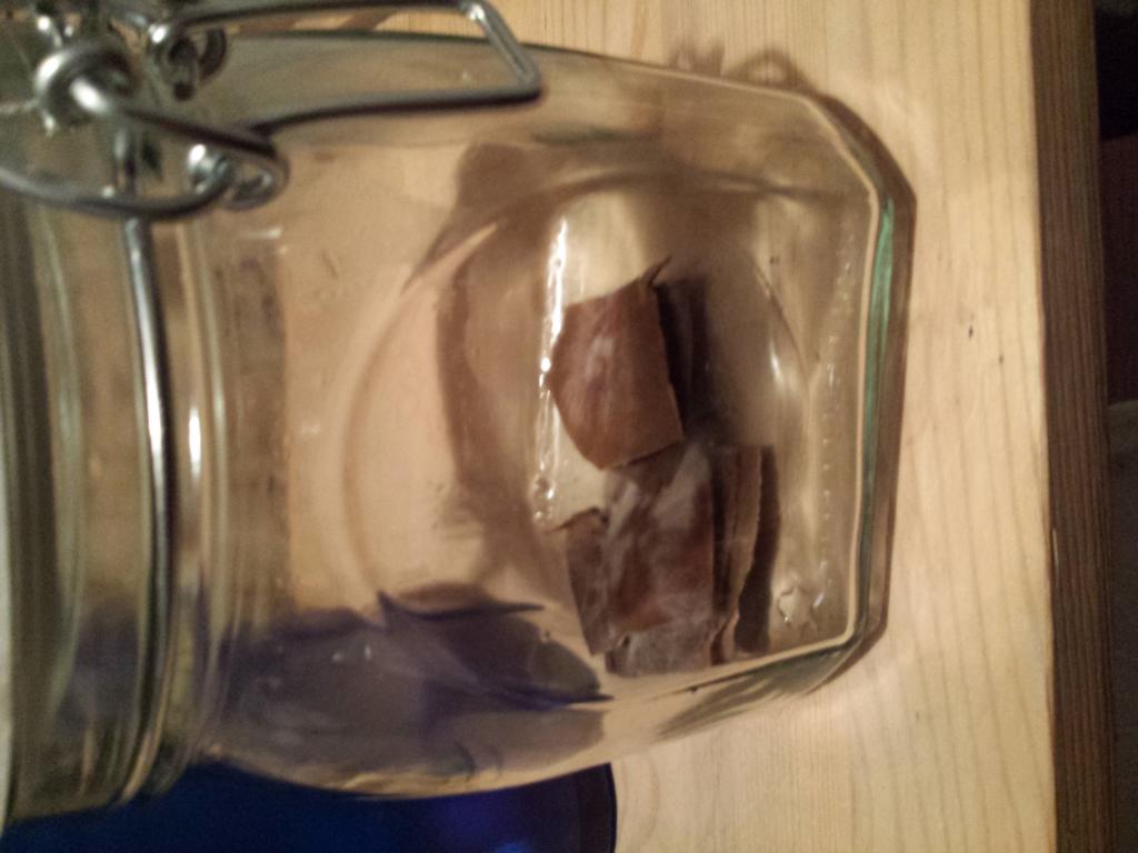 Bis jetzt habe ich ca. 16 Gläser mit Austern, Shii Take und Kräuterseitlingen angesetzt. Hierzu habe ich Pappe gekocht, und anschließend Pilzstücke in den Zwischenschichten unter gebracht.