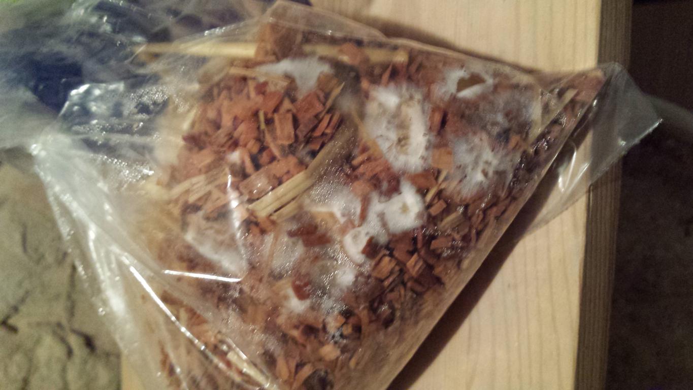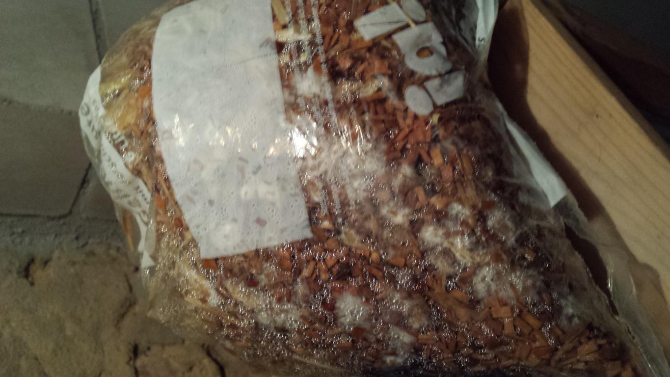 Nach einer Woche macht sich im großen Beutel ein Fermentationsgeruch breit (nicht unangenehm, aber irgendwas passiert da abseits des Pilzwachstums). Bakterienwachstum war zu erwarten, die Frage ist, können die Austern das Ganze überwuchern?