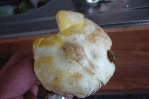 Da musste ich eben gerade gleich nochmal gucken, also am Stiel auf jedenfall, geht später ins braune über. Wollte den Pilz jetzt aber nicht ganz durchschneiden...