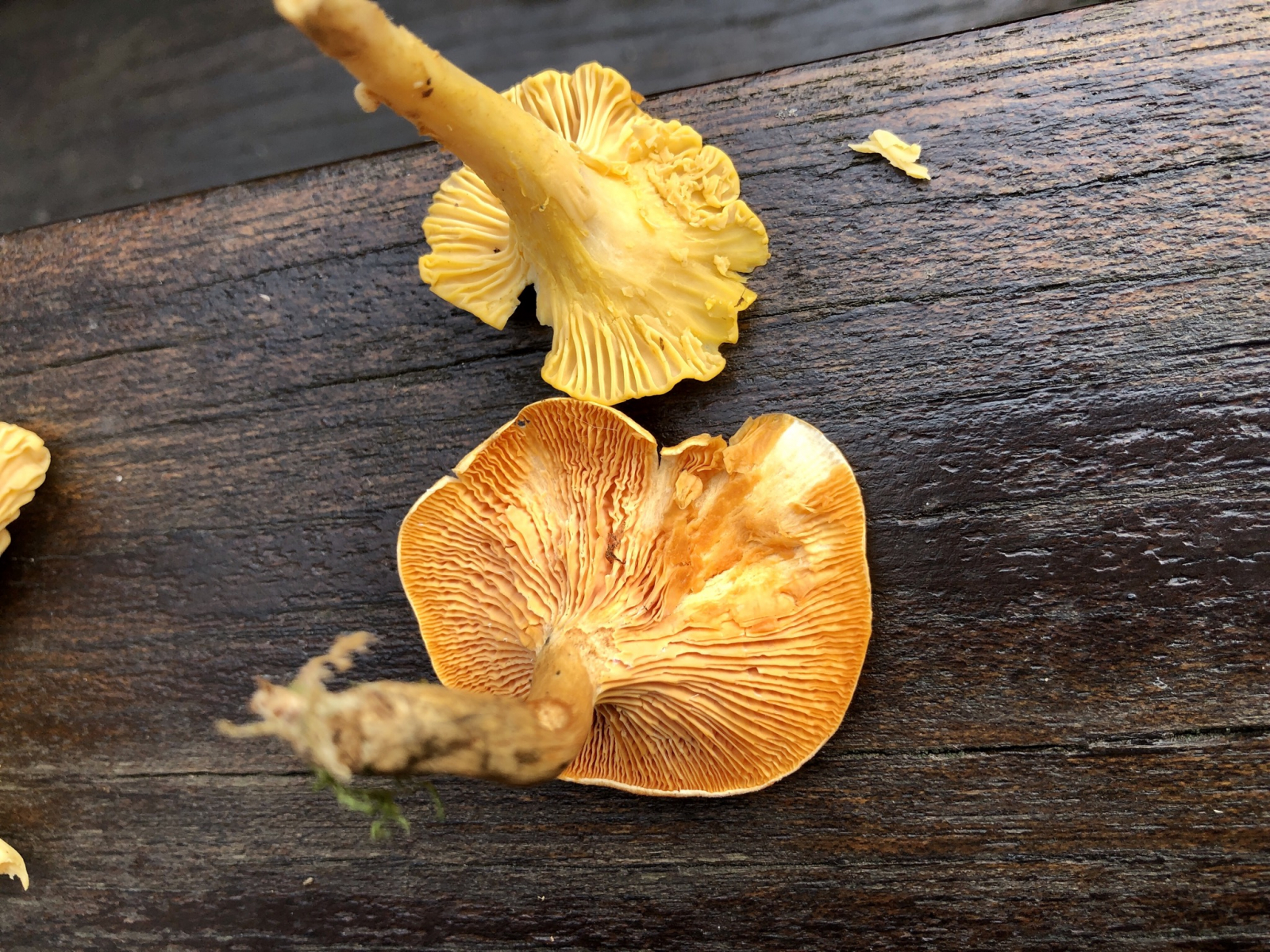 rechts Falscher Pfifferling mit dichtstehenden Lamellen, die hier schon etwas älter, aber dennoch erkennbar gegabelt sind.