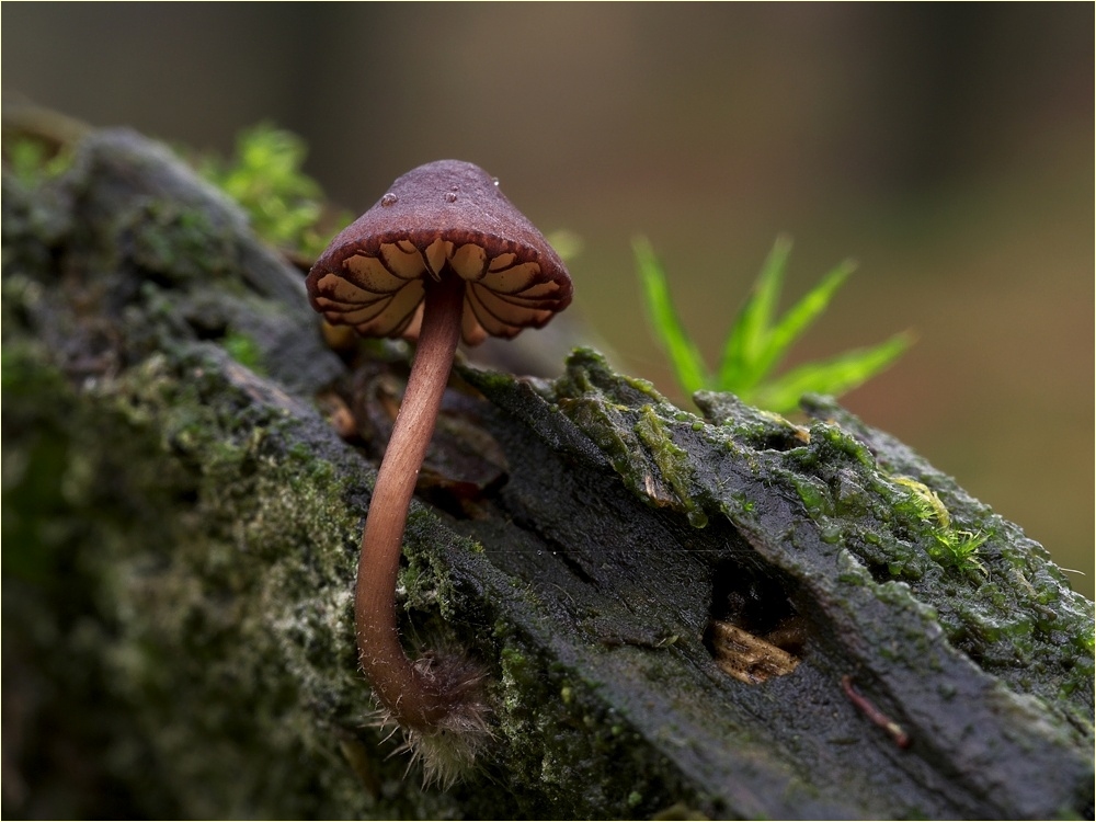 der Purpurschneidige Bluthelmling, Mycena sanguinolenta ist eigentlich ein häufiger Pilz und trotzdem hatte ich ihn gestern zum ersten Mal vor der Linse.
