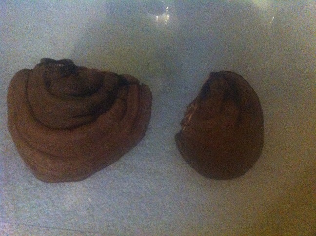 Vom Nachbarbaum hab ich ein paar kleinere andere Porlinge mitgenommen, die ich aber noch vernünftig ablichten muss. Die Handyfotos sind einfach nicht zu gebrauchen. Komische Teile. Mattbraun mit leichtem Rotstich, innen komplett dieselbe Farbe, die Röhrenböden mit einem nebelfarbenen Ton überzogen und auf Druck auf diese Schicht braunt er.