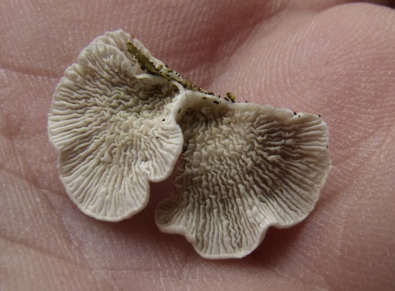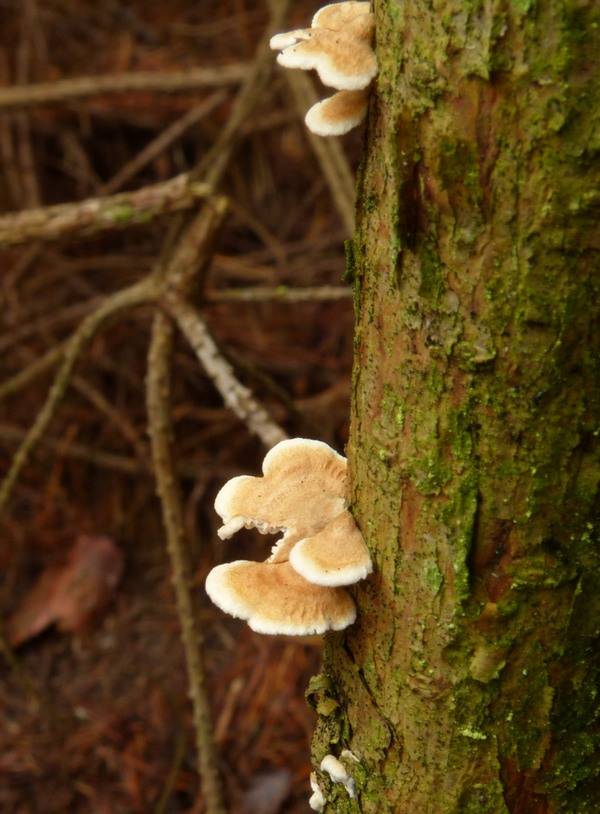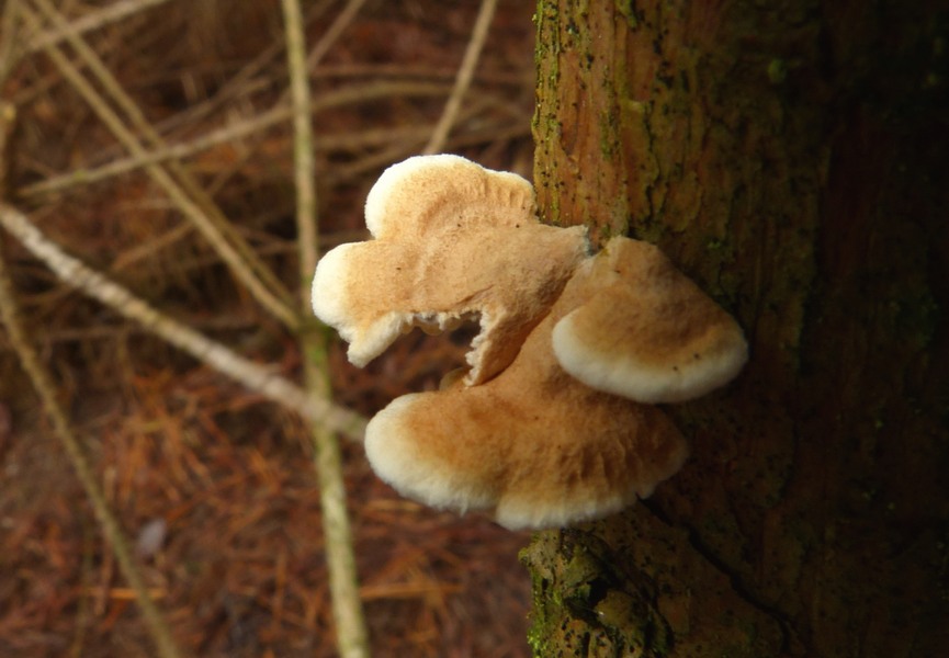 Diese Pilze erinnerten mich heute irgendwie an Plicatura crispa... sie wuchsen aber im Kiefernwald an einem jungen Kiefernstamm.