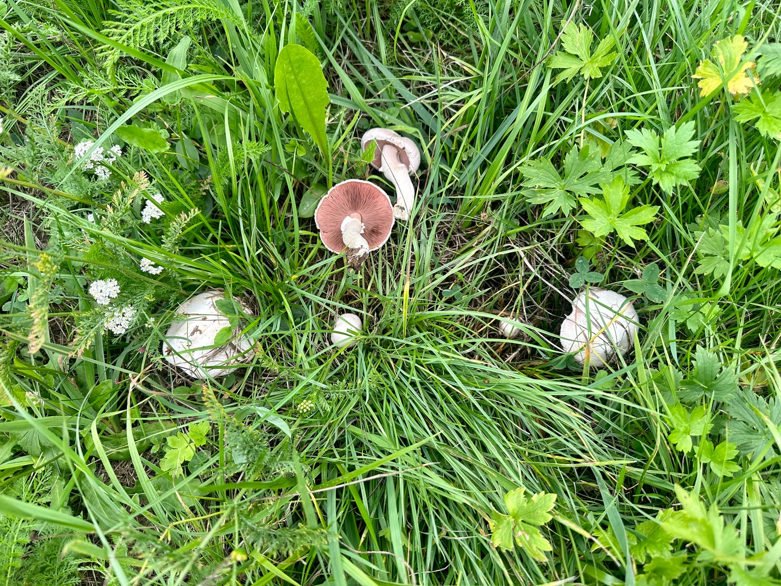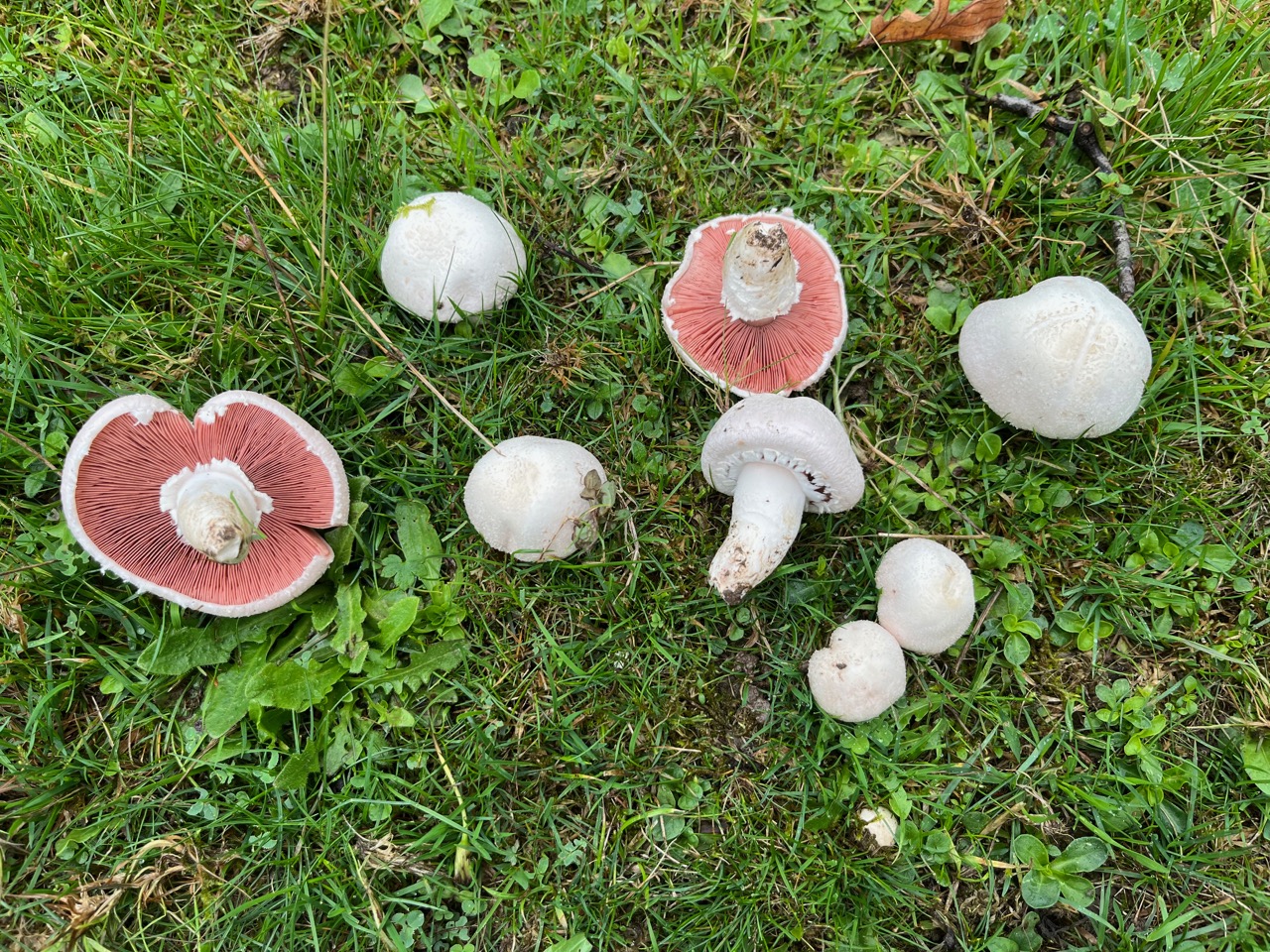 Wissenswertes: Vom Wiesenchampi sind etliche Formen und Varietäten beschrieben. Inwieweit diese zu Agaricus campestris s.str. bzw. zu anderen Arten zu rechnen sind, ist mir nicht so ganz klar. Eine Ausprägung mit noch stämmigerem Wuchs, deutlicher und meist dunkel (bräunlich) geschupptem Hut (Agaricus campestris var. squamulosus) dürfte dem Purpurbraunen Egerling (Agaricus cupreobrunneus) sehr ähnlich sehen.