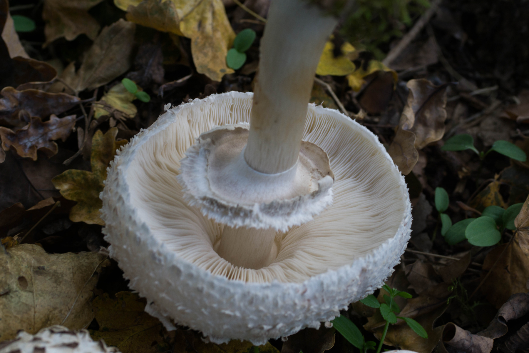 Der Acker – Riesenschirmling verfärbt nicht und hat einen einfachen Ring.