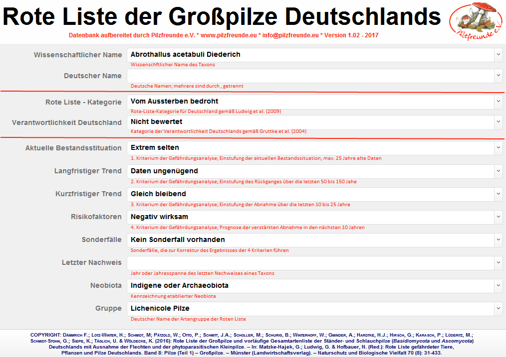 Sie weist wie die gedruckten Roten Listen auf bundesebene alle Arten nach, nicht nur gefährdete oder seltene Arten. Sie umfasst für die Pilze sowohl Großpilze als auch Schleimpilze und Flechten