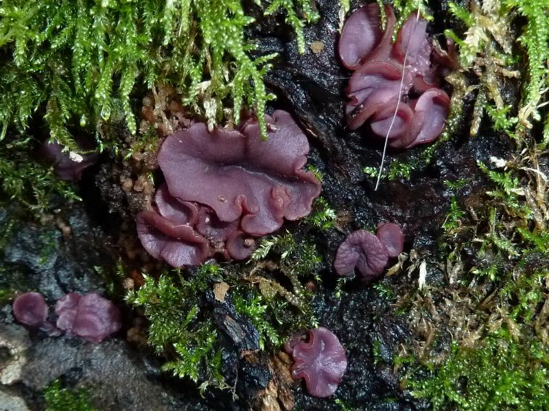 Heute fand ich an einem liegenden bemoosten Weidenstamm diese Becherlinge. In Gruppen/Büscheln gewachsen , Einzelbecher bis 2cm breit , Rand gewellt , Innenseite glänzend Violettbraun , Außenseite ebenfalls , leicht bereift.