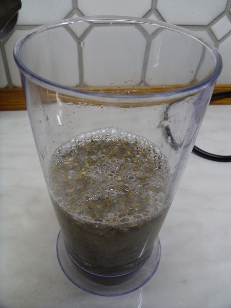 wieder wird der Pilz mit dem Wasser püriert, dann die Strohpellets hinzugegeben