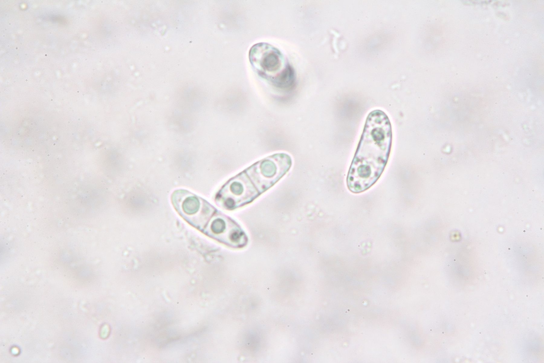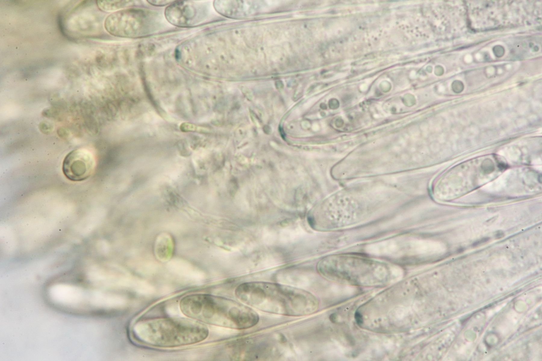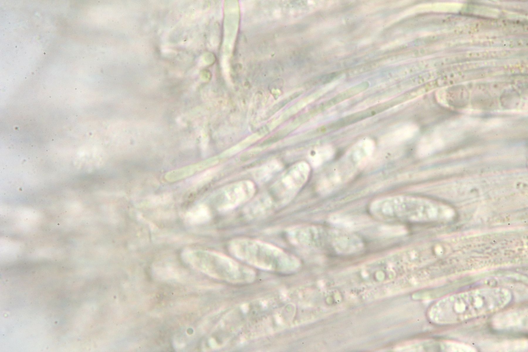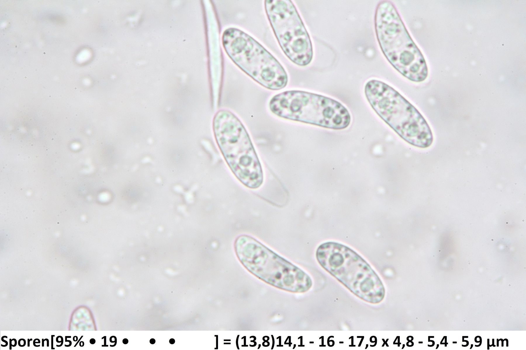 Bisporella citrina hat Sporen um 8-12(14) x 3-4, hier sind es schon deutlich größere.