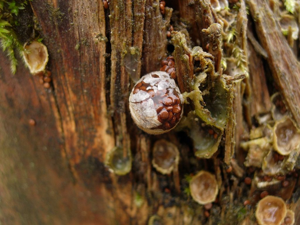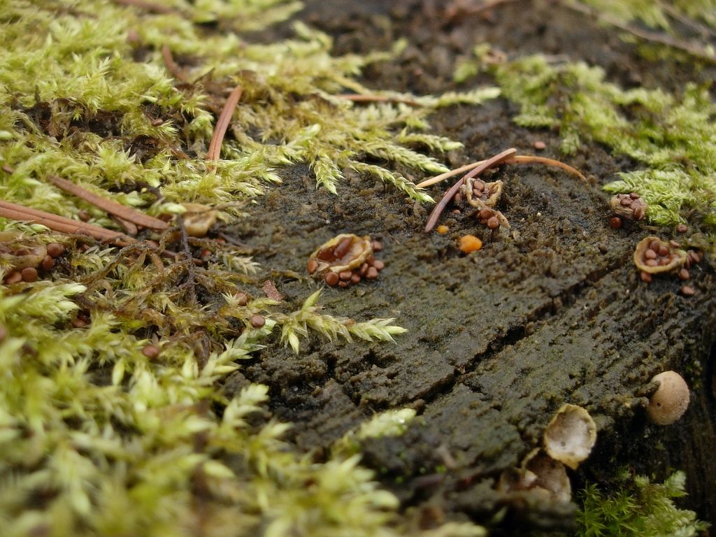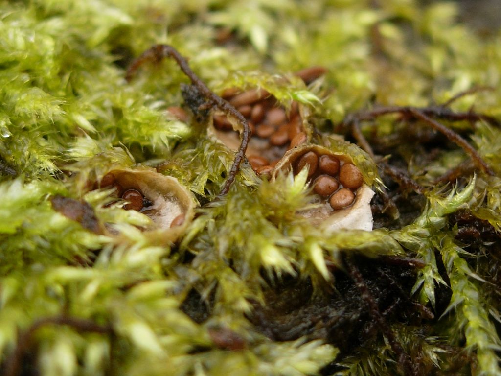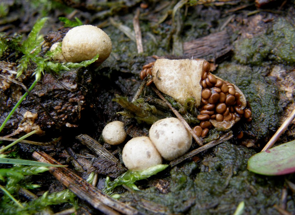 Fruchtkörper: Die Fruchtkörper sind sehr klein (0,5-1cm) und mehr oder weniger kugelformig, die Oberfläche ist hell-beige und leicht bis stark beflockt, bei Reife reisst sie auf und bringt kleine, beige-grauen bis braunen, linsenförmige peridiolen ans licht die in eine gelatinöse Masse eingebettet sind.