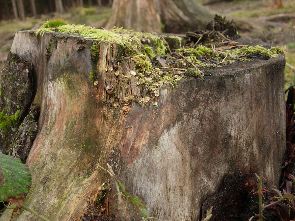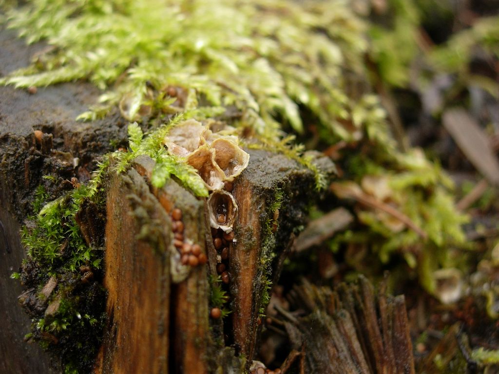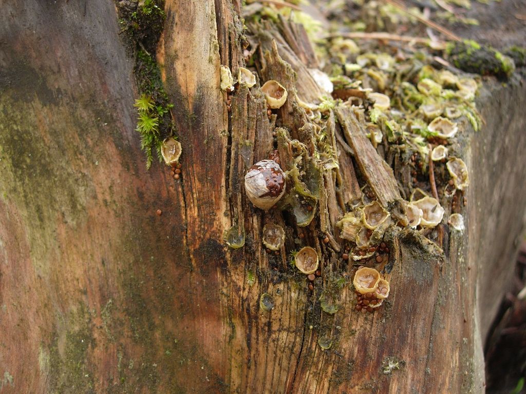 Substrat ist Nadelholz, Kiefer oder Lärche, liegender Ast teils im Laub vergraben