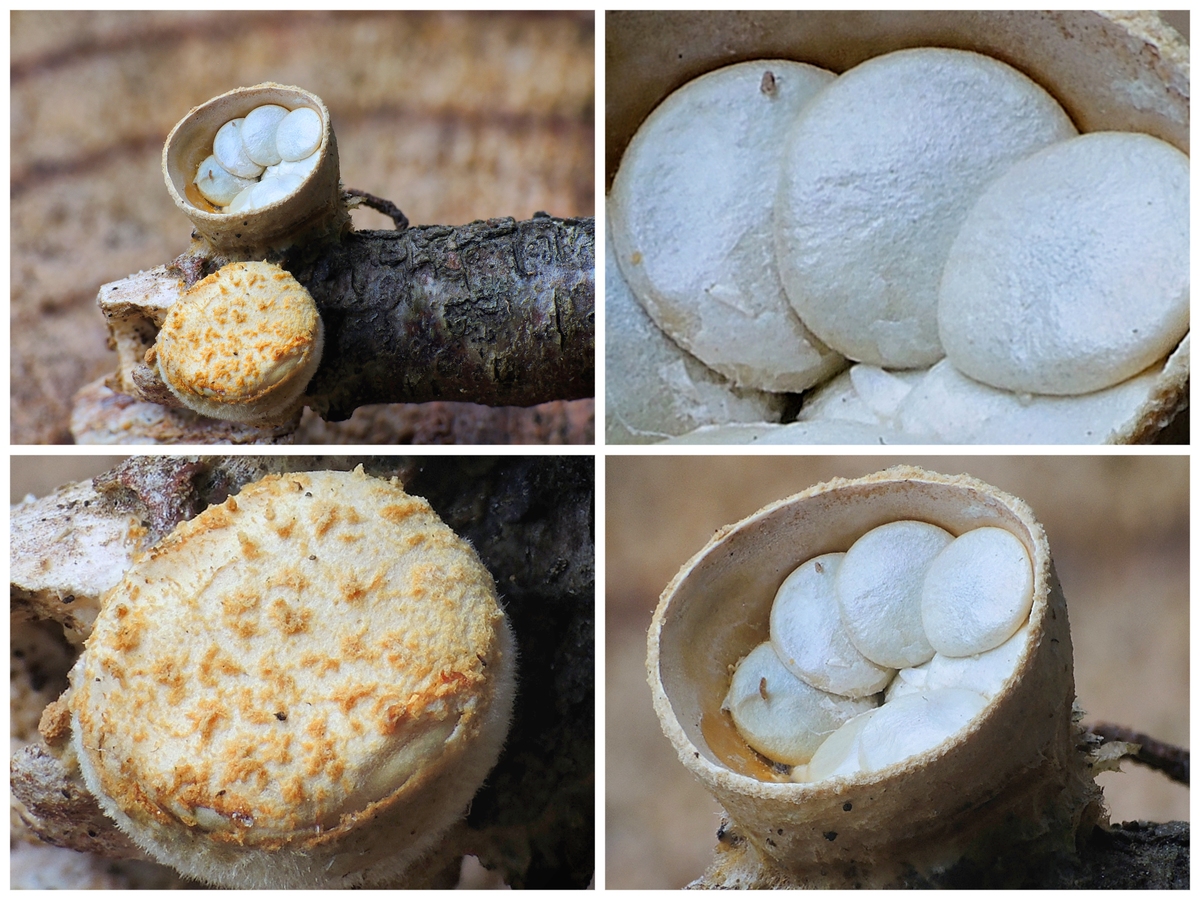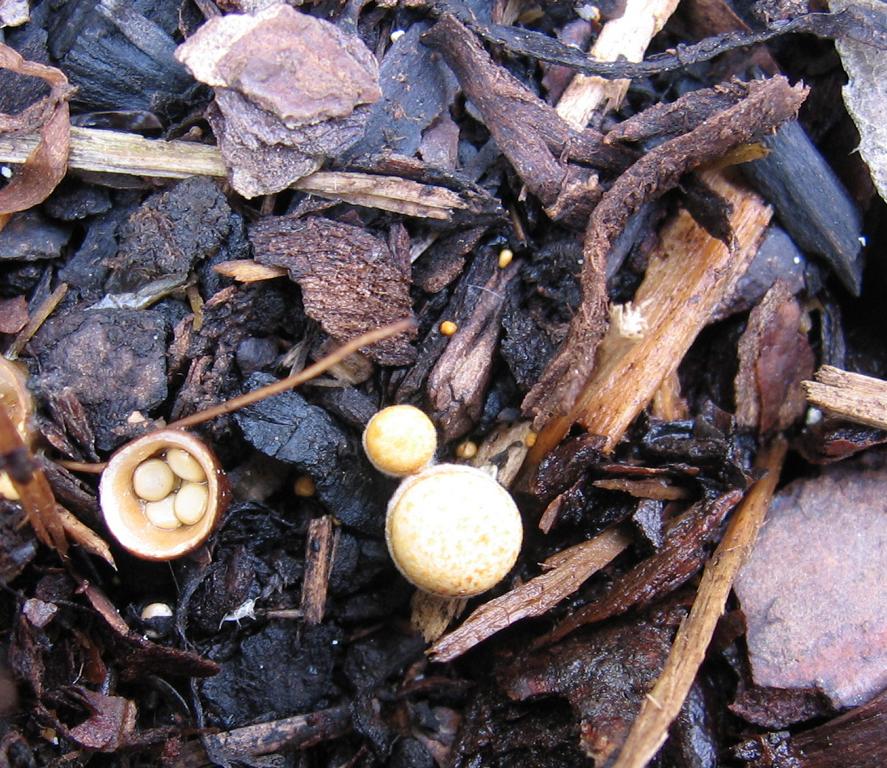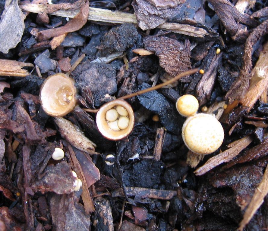 Fruchtkörper: Schüssel mit cremefarbenen, gelbbraunen, alt schwarzbraunen Sporenbehälter, die wie kleine Steine in einer Schüssel aussehen. Im Alter werden diese Steine ausgespült und der Behälter wird leer.