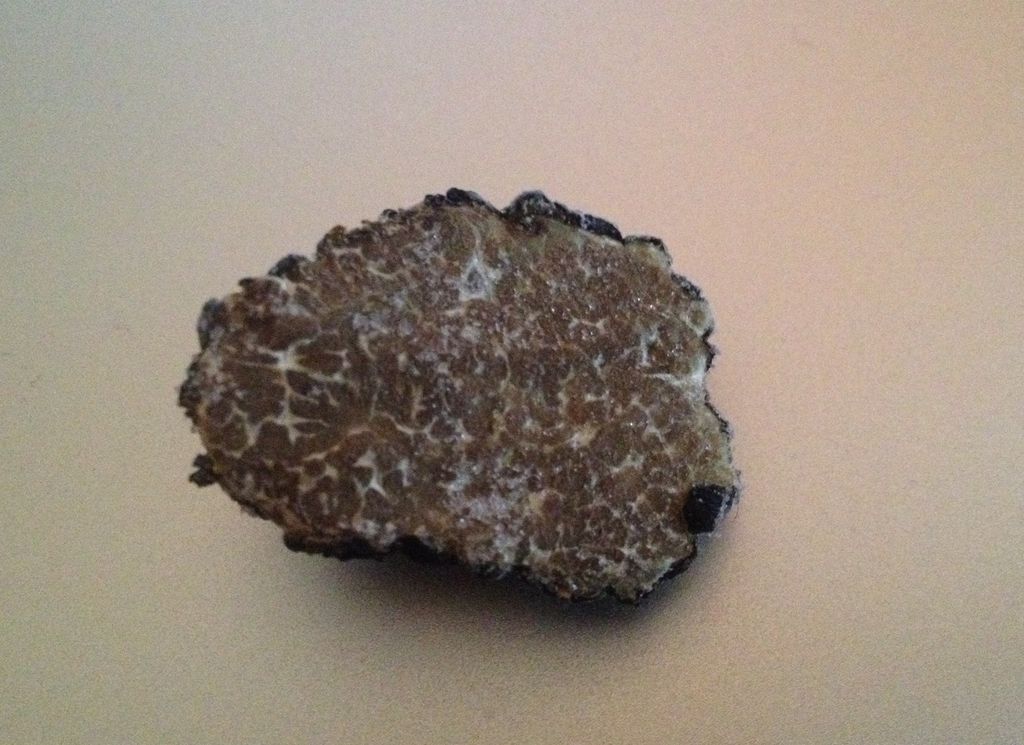 nach dem Schnittbild würde ich nun doch mit der Wintertrüffel (Tuber brumale) vergleichen.
