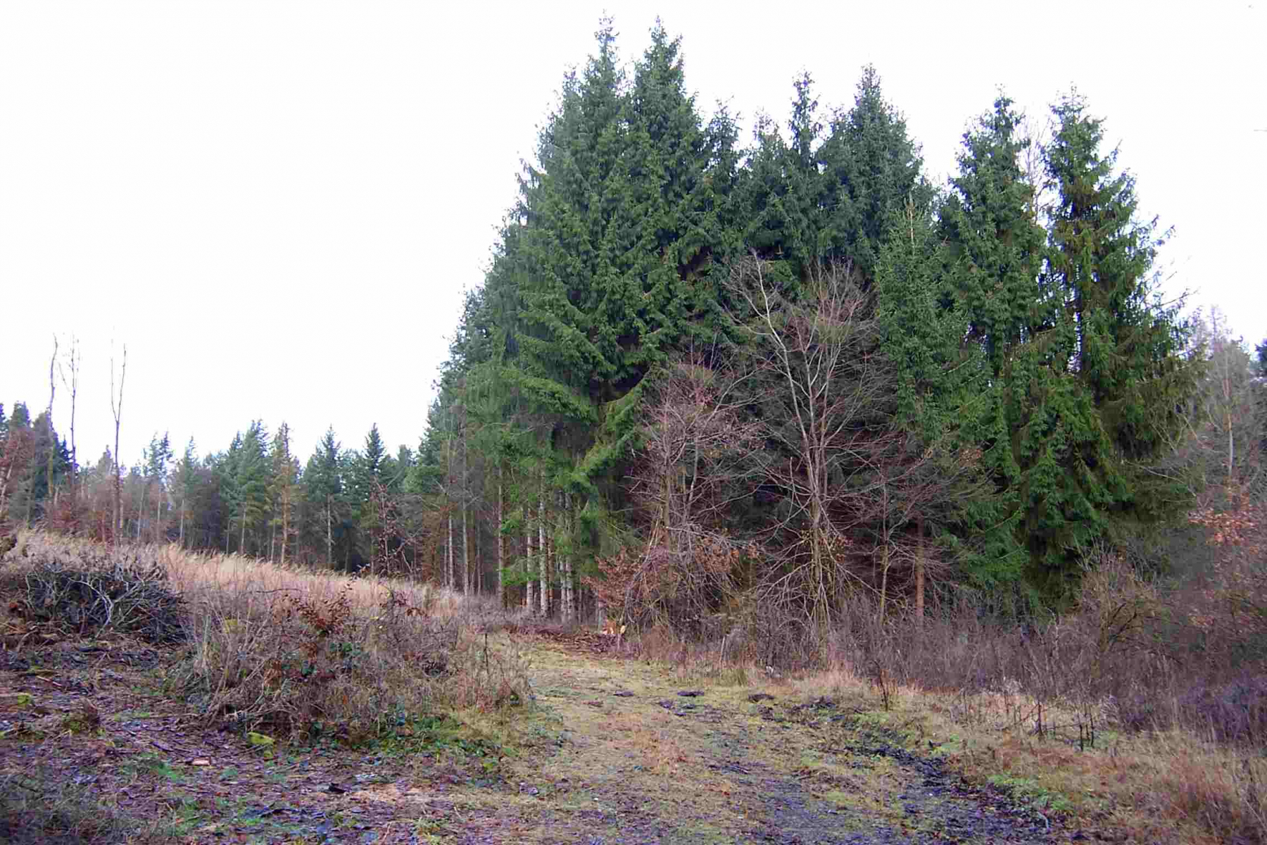 Der Standort war vorne an der linken Ecke von dem Fichtenforst. Das sieht nicht so spannend aus. Die Freifläche ist eine Folge der Stürme Mitte vor ca 5-10 Jahren. Damals sind hier viele Fichtenwälder umgeworfen worden.