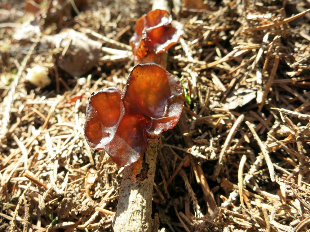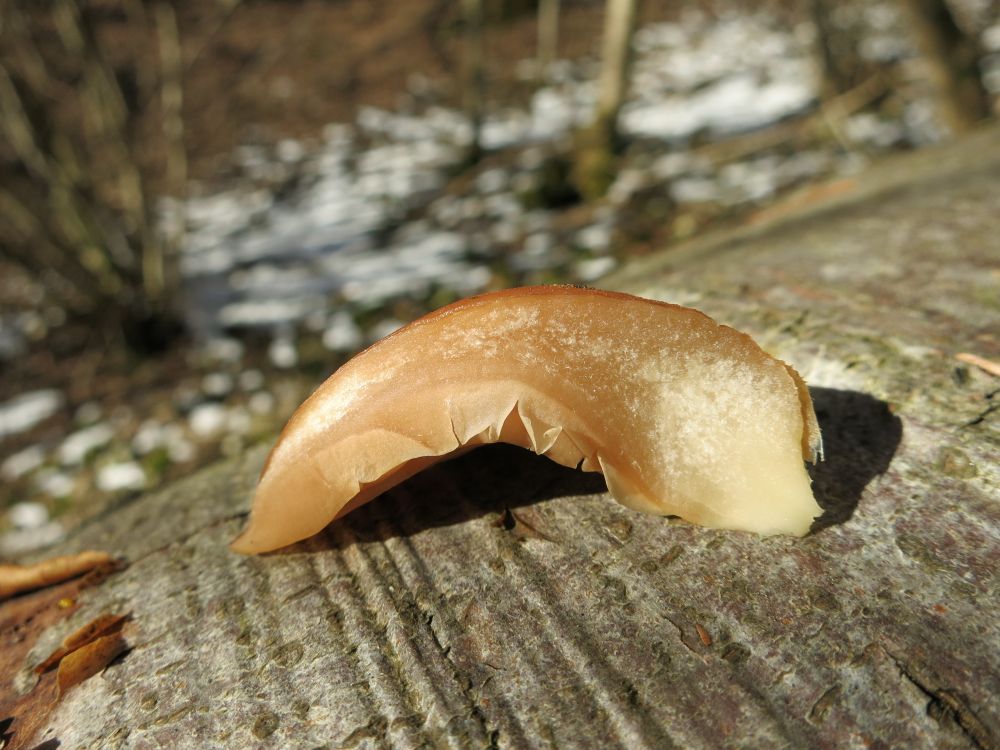 • Ich weiß nicht, ob wirklich alle Pilze geklärt sind. Die Pilze auf den Bildern 1 und 2 würde ich von der Optik her schon für alte Judasohren halten. Wir waren gestern mit dem Verein Judasohren sammeln, und wir haben sehr viele live sehen können. Man sollte mit dem Finger über die Oberfläche fahren, um zu spüren, ob sie trocken/feinsamtig (Judasohr) oder feucht/gallertig (Drüsling) ist. Insbesondere wenn sich eine glatte Innenseite deutlich von einer feinsamtigen Außenseite unterscheiden lässt, geht der Verdacht in Richtung Judasohr.