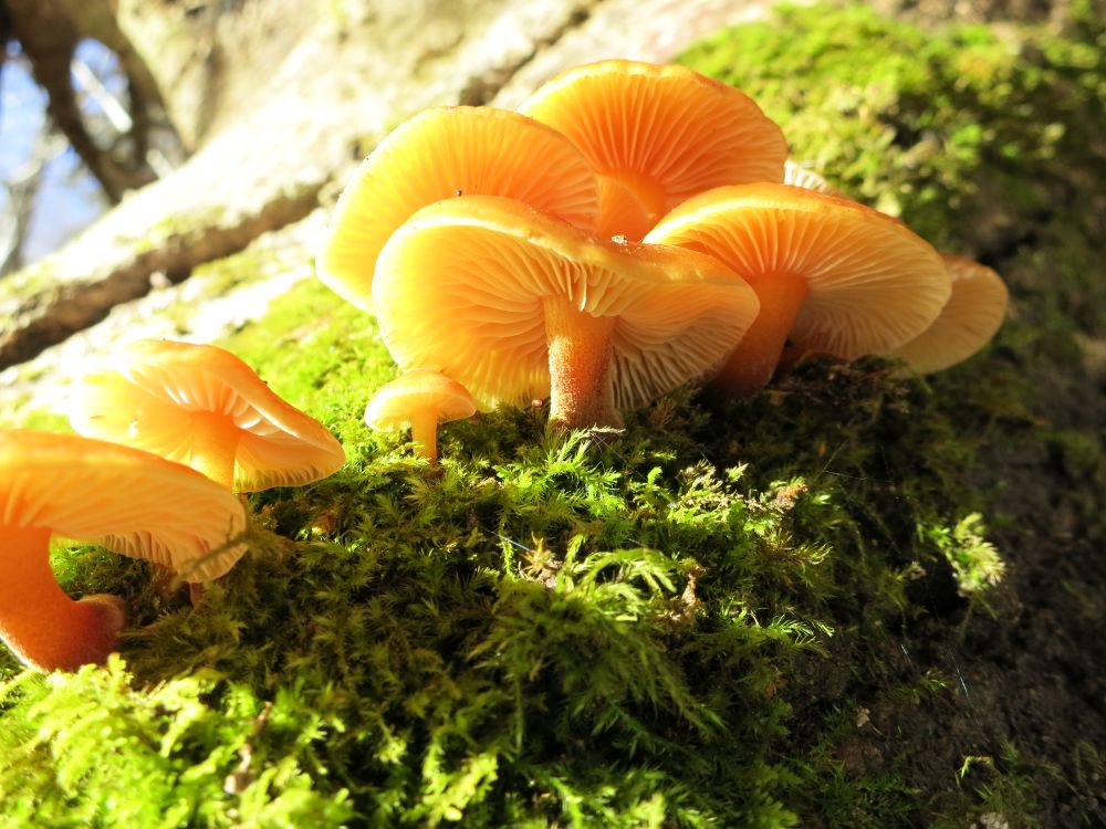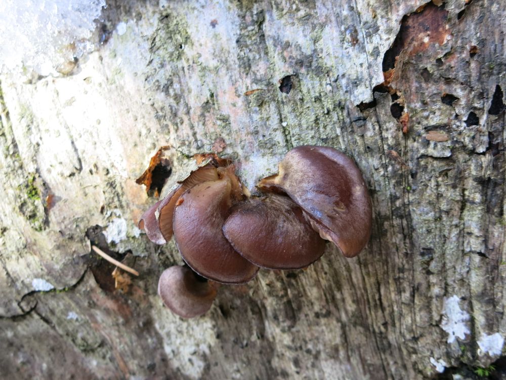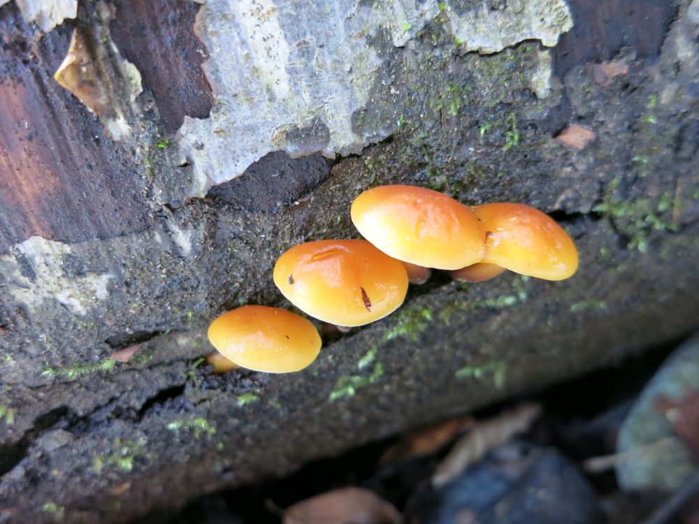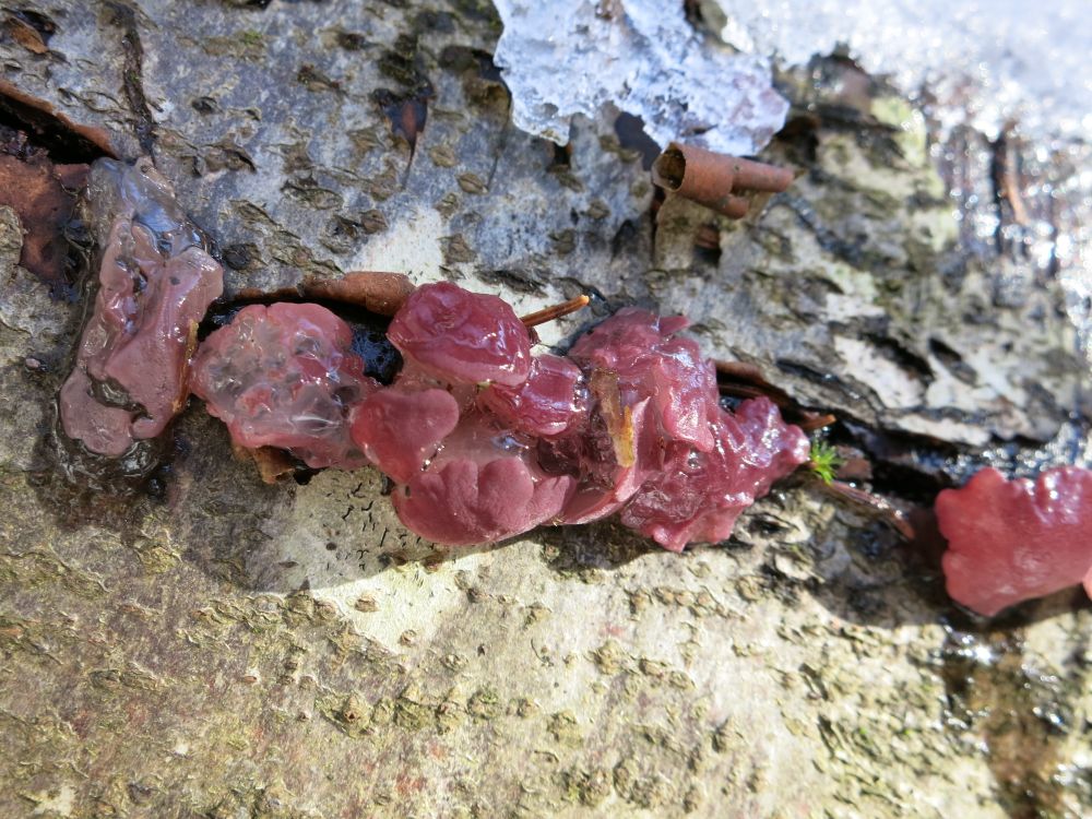 das Judasohr ist der Kreseldrüsling (Exidia recisa), der Austernseitling ist der Gelbstielige Muschelseitling (Sarcomyxa serotina) und der Violette ist ne Ascocoryne. Der gelbe Schleimpilz ist Hemitrichia serpula und der kleinere rote eine Metatrichia, dürfte M. vesparium sein.