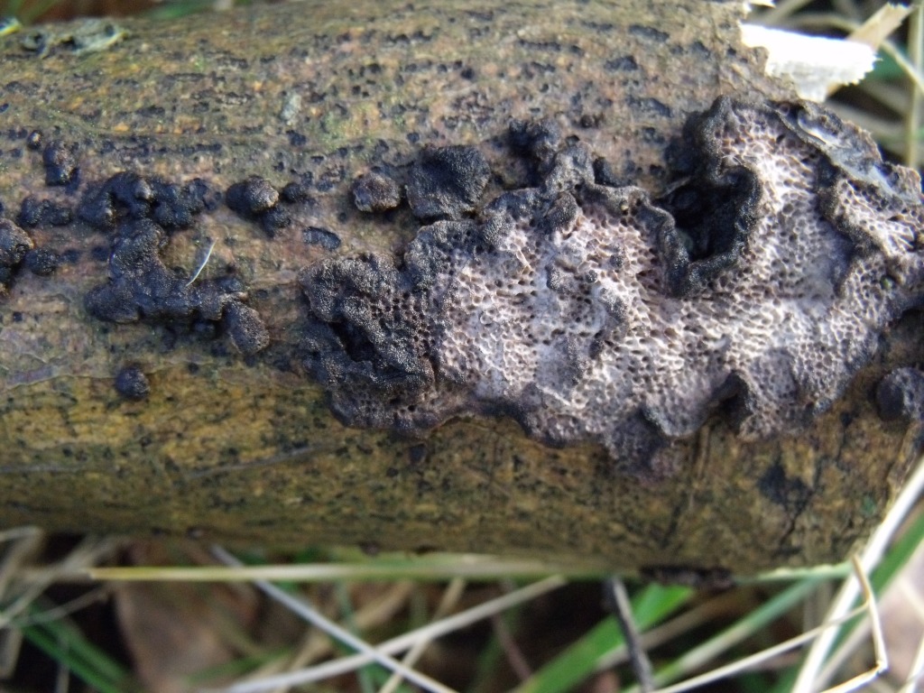 Das zweite Interessante am Ginster war der Porling. Flach, elastisch, abziehbar vom Ast. Die Poren waren ohne Lupe erkennbar. Auf dem ersten Bild ist der große "Fleck" ca. 4 cm lang. Der Ginster war abgestorben. Der Pilz siht aus, als wenn er zusammenfließt/ zusammenwächst! Ich finde leider keinen richtig Passenden.
