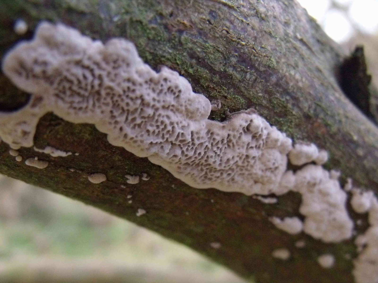 Das zweite Interessante am Ginster war der Porling. Flach, elastisch, abziehbar vom Ast. Die Poren waren ohne Lupe erkennbar. Auf dem ersten Bild ist der große "Fleck" ca. 4 cm lang. Der Ginster war abgestorben. Der Pilz siht aus, als wenn er zusammenfließt/ zusammenwächst! Ich finde leider keinen richtig Passenden.