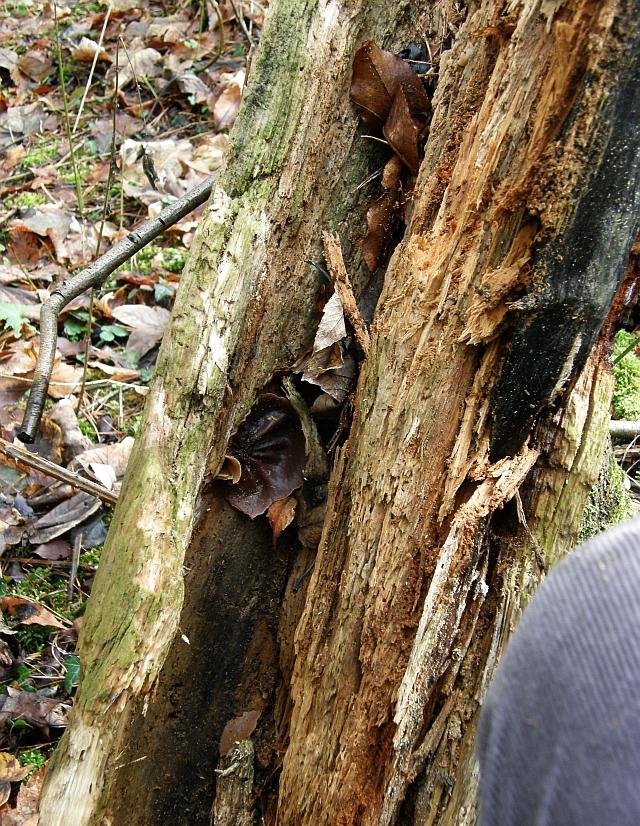 Das Substrat ist aber ein anderer Stamm, etwa zwei Meter neben dem mit den Blaugrauen Muschelingen. Ob Nadel- oder Laubholz kann ich so unmöglich sagen. Aber wenn ich die Art richtig geraten habe, ist es Laubholz.