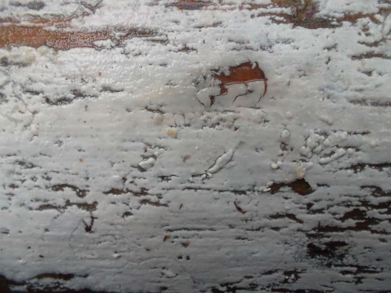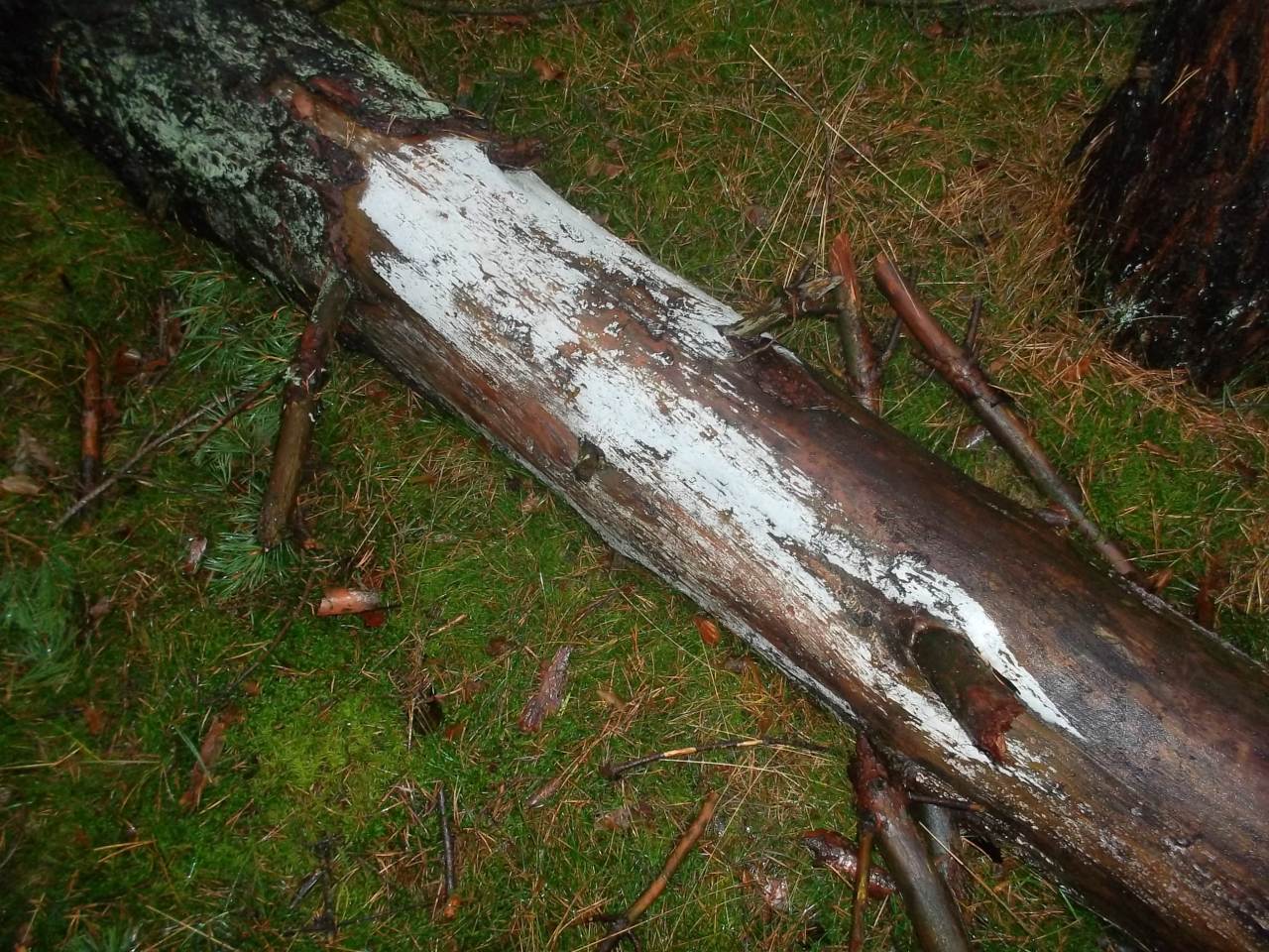 Ist eine blöde Jahreszeit, im Hellen muß man arbeiten und in der Freizeit ist es dunkel. Da bleibt nur die Mittagspause um mal nach Pilzen zu schauen. Da habe ich dieses unübersehbare "Weiße" gefunden. Ich habe keine Ahnung was das ist. Der Baumstamm ist Kiefer. Das "Weiße" ist dünn (ca.1mm dick) und wie ganz weiches Wachs. Nun habe ich gesucht und was nicht wirklich passendes gefunden. Weißer Rindenpilz (Athelia epiphylla). Aber der wächst auf Rinde, bei meinen Fund nicht. Ist das ganz was anderes oder einfach ein seltener "Schimmel"??? Das Weiße scheint auch andere Pilze (die schwarzen Gnubbel) zu überwachsen!