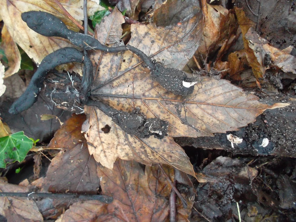 Ja, noch was interessantes, die Langstielige Ahorn-Holzkeule (Xylaria longipes). Die habe ich für das Foto ausgegraben! Die wachsen an der Unterseite vom "vergrabenen" Holz.