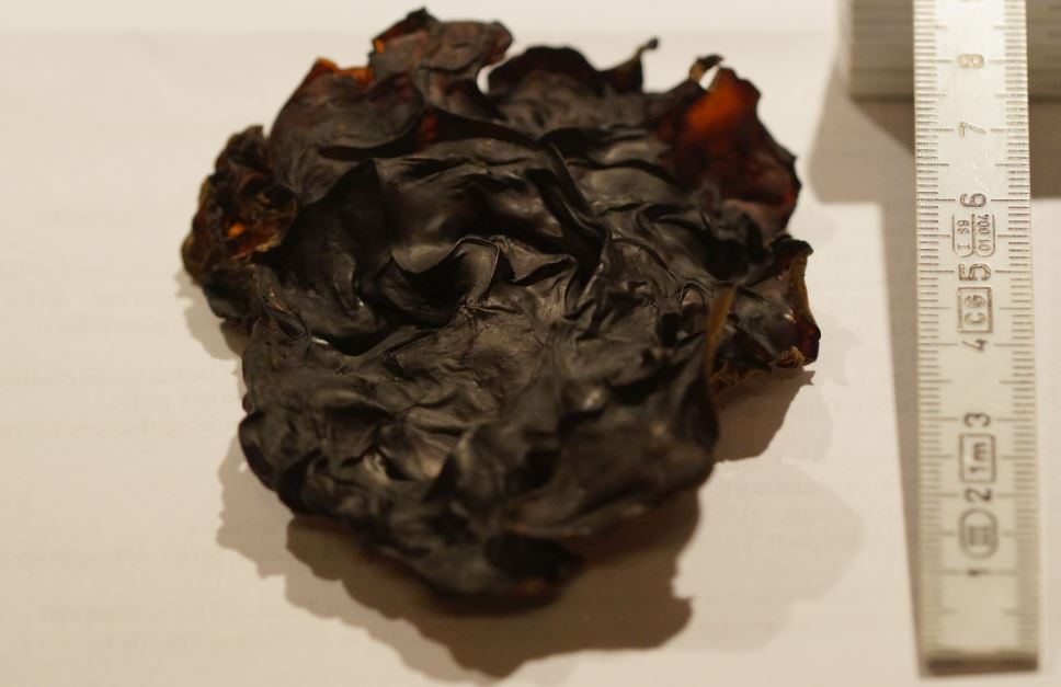 Getrocknete Judasohren werden auch recht dunkel, Du warst vermutlich auf der Suche nach eben diesen. Wenn Du mal welche findest, die getrocknet sind, löse sie vom Substrat ab, nehm`sie mit nach Hause und lege sie in Wasser. Die Farbe wird sich deutlich verändern und auch das Volumen des Fruchtkörpers.