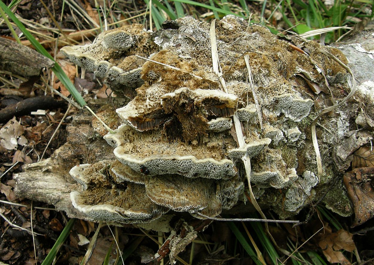 Erst dachte ich, zum dritten Mal Trametes cervina (Trametopsis cervina), die hirschbraune Tramete, gefunden zu haben, so ähnlich sahen die Wuchsanordnung und die Hüte von oben aus.