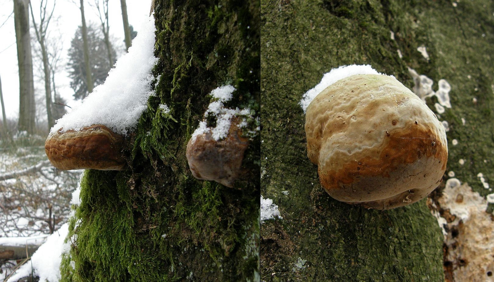 Ich beobachte einen "in der Luft schwebenden" Buchenstamm mit Fomes fomentarius, wo die neuen Pilze so eine verwirrend leuchtend-rote Zuwachskante hatten.