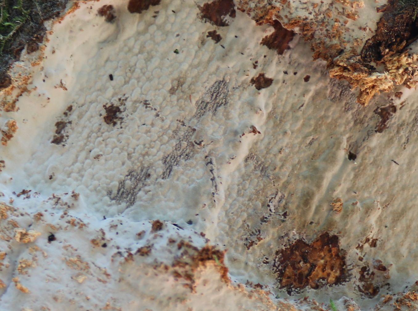 Geotropismus: die Unterseiten neuer Fruchtschichten zeigen immer zum Erdboden, deshalb kommt es bei Lageänderung des Substrats zu unterschiedlichen Ausrichtungen eines einzelnen Pilzes oder zu verschieden ausgerichteten Pilzen am gleichen Stamm.