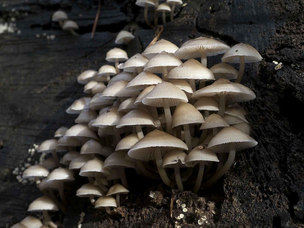 heute fand ich an einem alten, liegenden Buchenstamm fast weisse Mycenas, die ich nicht zuordnen kann.
