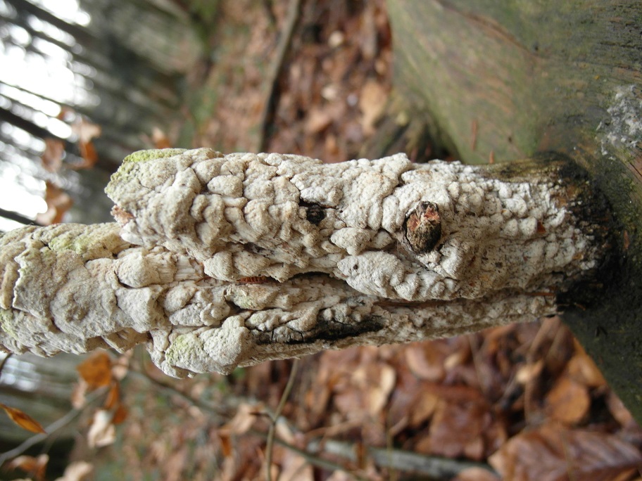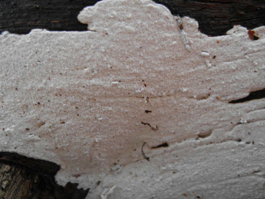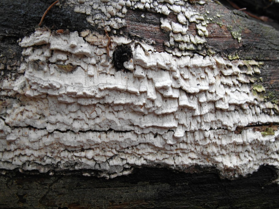 An liegendem Fichtentotholz habe ich heute einen harzig-fruchtig riechenden, weissen Porling gefunden. Seine Wuchsform war sehr veränderlich, von komplett resupinat und flach bis deutliche kleine Hütchen bildend. Erst als ich die Hütchenform sah, kam mir der Gedanke Antrodia xantha, vorher wäre ich niemals darauf gekommen. Die Pilze waren im Gegensatz zu Antrodia serialis eher bröckelig als zäh und biegbar.