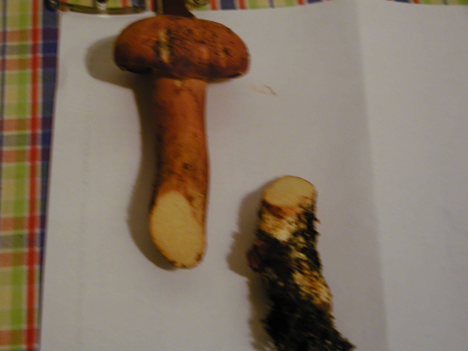 -Stil, Durchmesser 2,5 cm, glatt, , nicht blauend, unter dem Hut abgesetzt ca. 1cm gelb, dann ca. 2cm schwach geflockt wie beim –žFlockenstiligen Hexenröhrling–œ, dann 8cm samtig/braun, der Rest des Stiles bis zum Ende gelb, im Schnitt rein gelb bis zum Fuß