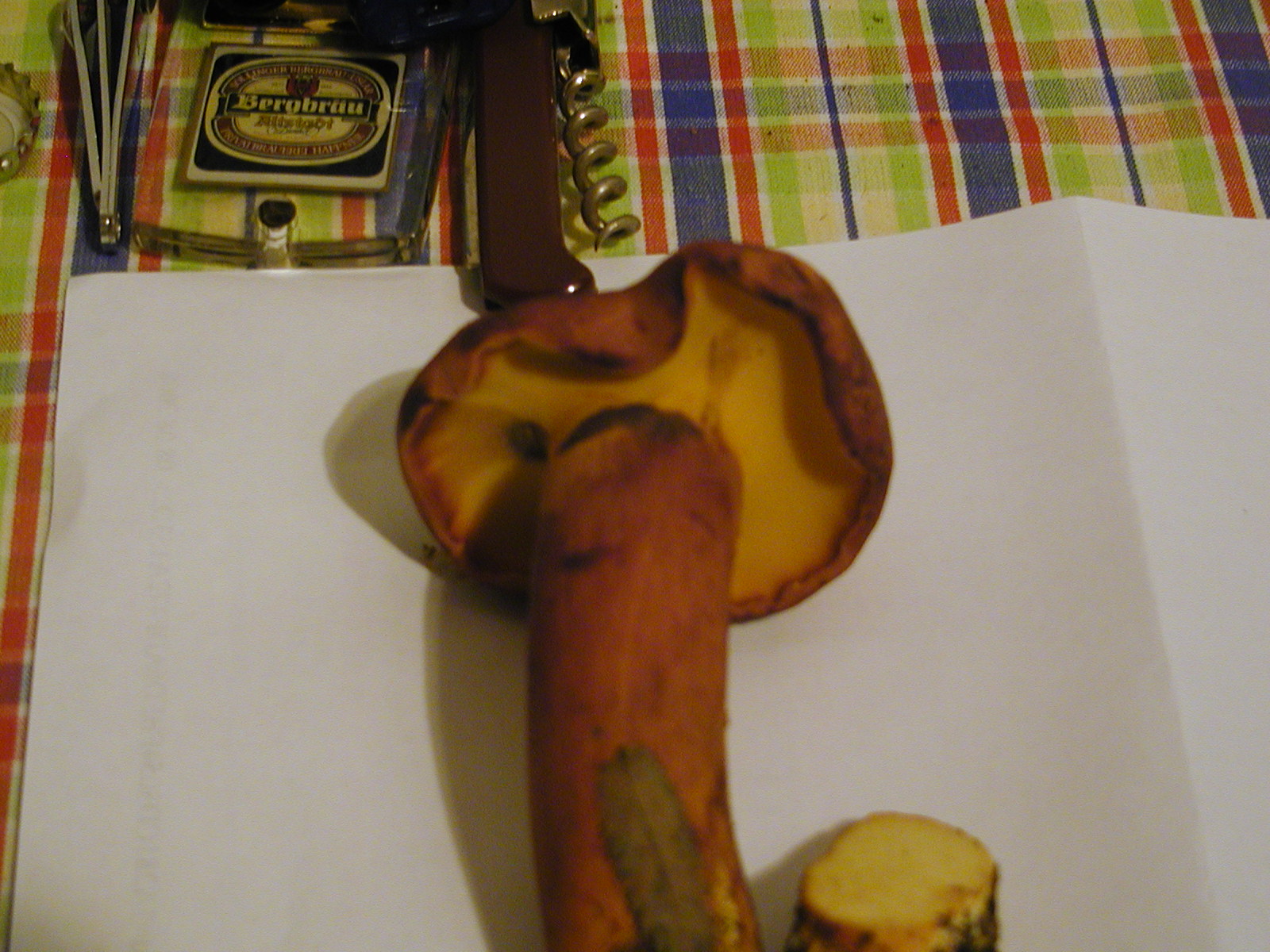 -Stil, Durchmesser 2,5 cm, glatt, , nicht blauend, unter dem Hut abgesetzt ca. 1cm gelb, dann ca. 2cm schwach geflockt wie beim –žFlockenstiligen Hexenröhrling–œ, dann 8cm samtig/braun, der Rest des Stiles bis zum Ende gelb, im Schnitt rein gelb bis zum Fuß