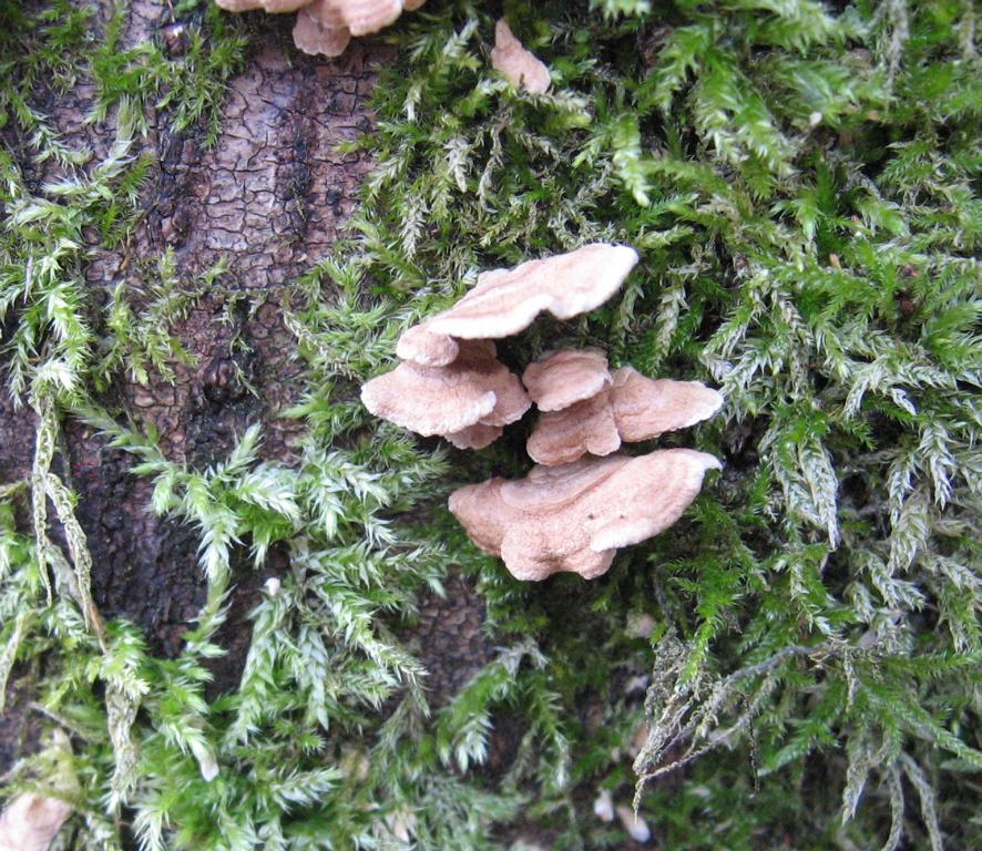 Unterseite lamellenartig, irgenwie mit Grünstich, im Moos am Laubholz