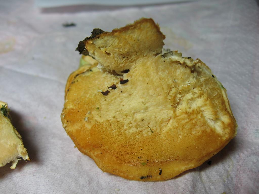Ist sehr flach, Geruch nach nichts, Oberseite schwach gezont, Rand ausgefranzt, grün werdend. Unterseite klitzekleine Poren, gelb, schmal angewachsen ca. 6cm breit.