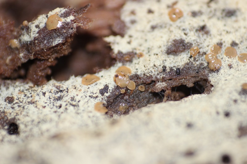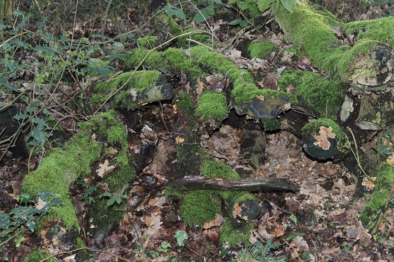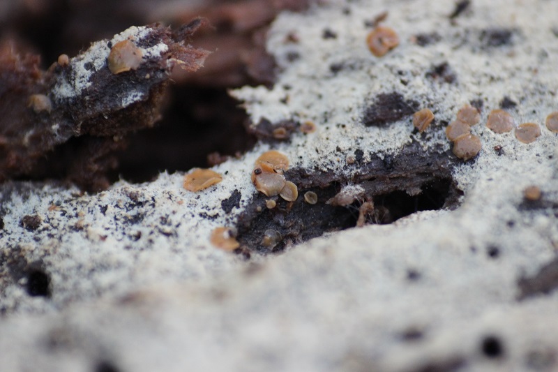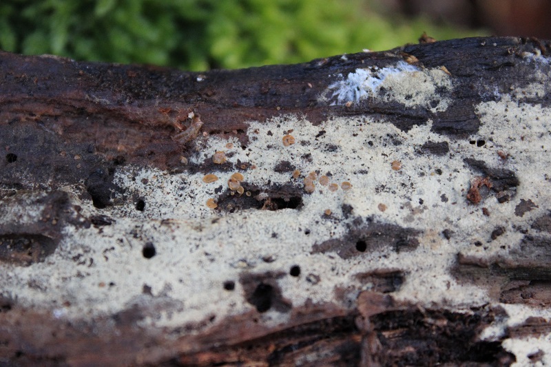 Gefunden habe ich in inmitten eines kleinen Holzlagers. Links unten ein Stück herausgezogen, was dann auch gleich wegen starker Vermorschung ordentlich zerfiel. Die oberen Äste sind Birke; zu welchem Substrat das betreffende Holzstück gehört, kann ich leider nicht genau sagen. Möglich wären noch Kirsche oder Eiche.