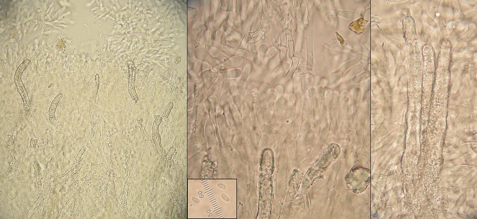 Sporen 5-6x2,2-3 µm, hyalin, glatt, ohne Tropfen, J-. Alle Septierungen ohne Schnallen. Aus dem Hymenium ragen inkrustierte Enden skeletoider Hyphen heraus (dimitisch!).
