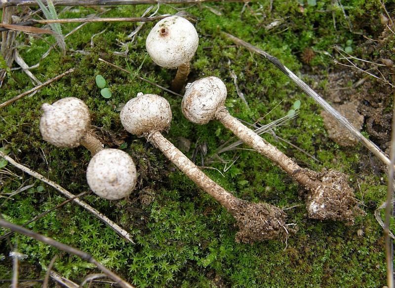 Fruchtkörper: Insgesamt bis maximal 4,5 cm hoch; gegliedert in Stiel und darauf aufsitzenden Kopf,der bis maximal 1cm breit werden kann. Stiel teils recht tief im Boden eingesenkt, basal mit Mycelbollen, dem Substratreste und Sand anhaften; Oberfläche weißlich, blass ockerlich oder auch bräunlich, etwas angedrückt schuppig;