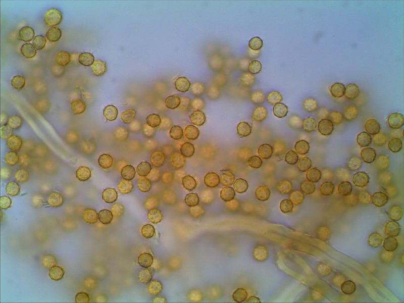 Sporen: Sporenpulver rostbraun; Sporen kugelig, warzig;
