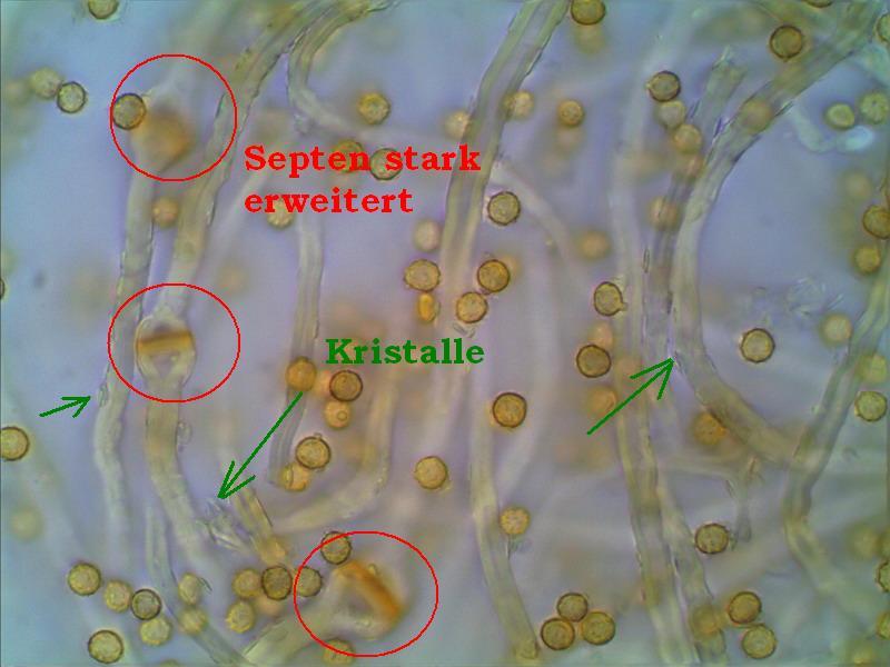 Capillitiumhyphen mit Kristallen, Septen deutlich erweitert (doppelt bis dreifach verdickt)