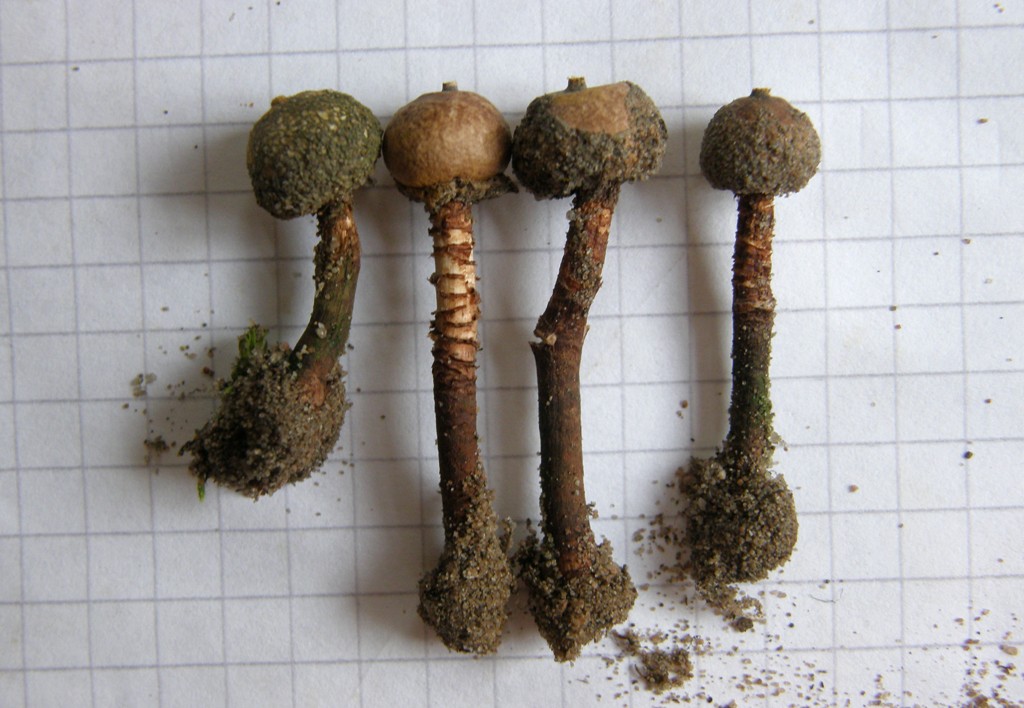 Fruchtkörper: Insgesamt bis maximal 4,5 cm hoch; gegliedert in Stiel und darauf aufsitzenden Kopf,der bis maximal 1cm breit werden kann. Stiel teils recht tief im Boden eingesenkt, basal mit Mycelbollen, dem Substratreste und Sand anhaften; Oberfläche angedrückt schuppig, Schuppen rotbraun bis weinrot;