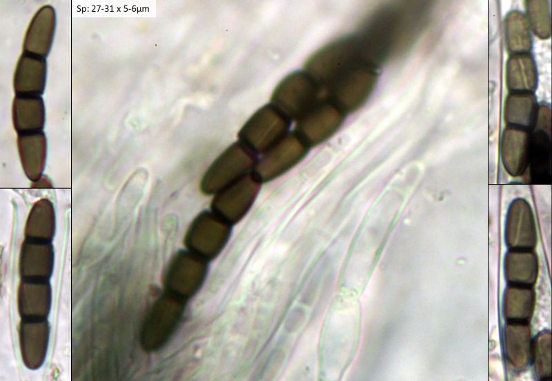 4. Das sieht nach einem imperfekten Pilz aus. Hab sowas noch nie gesehen, an der Spitze jeweils eine Konidiospore, 40-43 x 15-18 µm. Das Makrofoto ist leider nicht sehr gelungen.