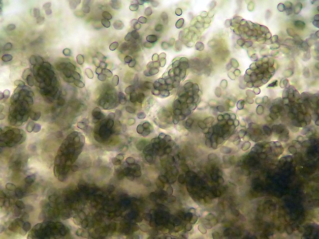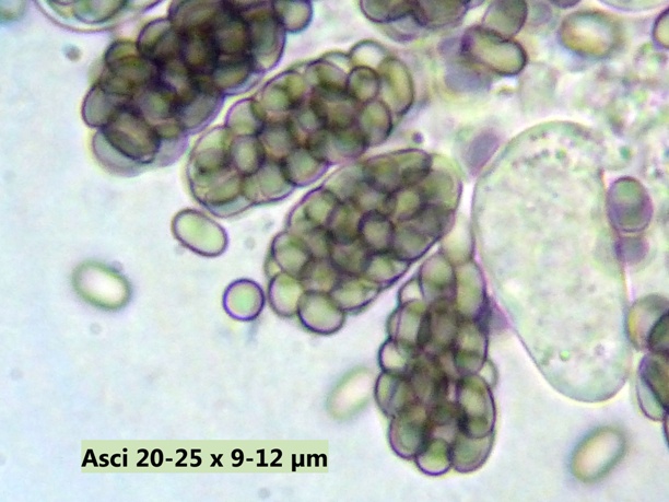 Ich meine 24, zylindische und im Querschnitt drehrunde, Sporen im Ascus zu zählen, lege aber meine Hand nicht dafür ins Feuer, können auch ein paar mehr sein. Das Ostiolum enthielt 40 - 50 Asci. Einen Moment lang war ich bei T. caninus hängen geblieben, passt aber auch nicht wirklich.