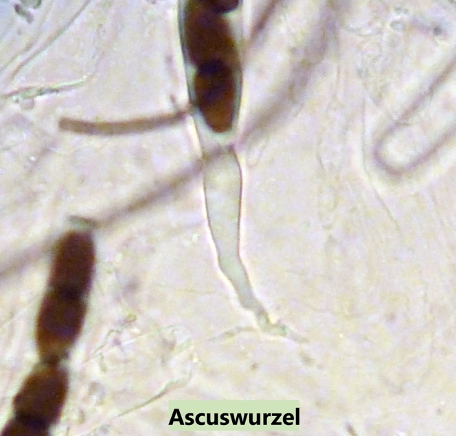 Unter dem Mikro fand ich sehr große Sporen, die nach Nobis und Peters Schlüssel eigentlich nur T. adelphica zuzuordnen sind. Die 3-teilige Gelhülle ist sehr ausgeprägt, die Keimporen hingegen wenig präsent.