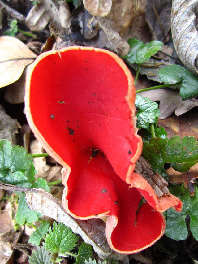 diesen Pilz habe ich im Waldmeister-Buchenwald vor drei Tagen gefunden. Es handelt sich vermutlich um einen Kelchbecherling, vielleicht Scharlachroter Kelchbecherling (Sarcoscypha coccinea). Fundort ist ein Waldmeister-Buchenwald im Münsterland.