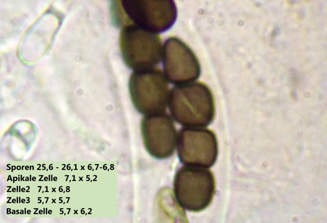 Die apikale Sporenzelle ist spitz, die basale abgerundet. Die Keimspalte läuft diagonal. Die einzelnen Zellen sind sehr deutlich und etwas schräg segmentiert.