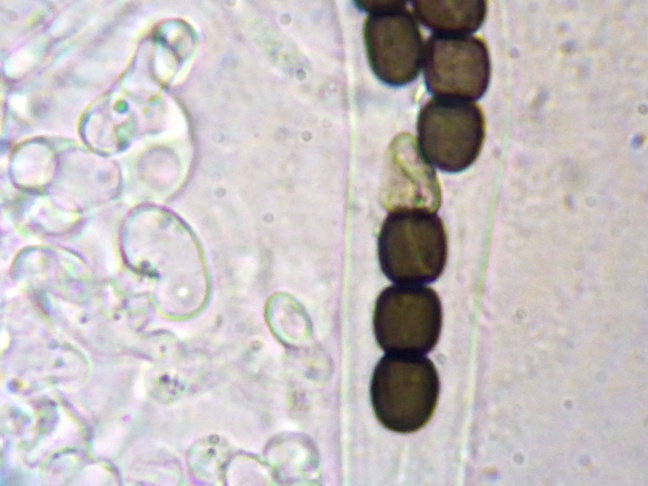 Es gab nur einen Ascus, der schon weit ausgezogen und stark gebogen war. Die Länge zu messen, machte keinen Sinn. Die Ascusbreite betrug 14,3 µm, die Wurzel 23 µm.